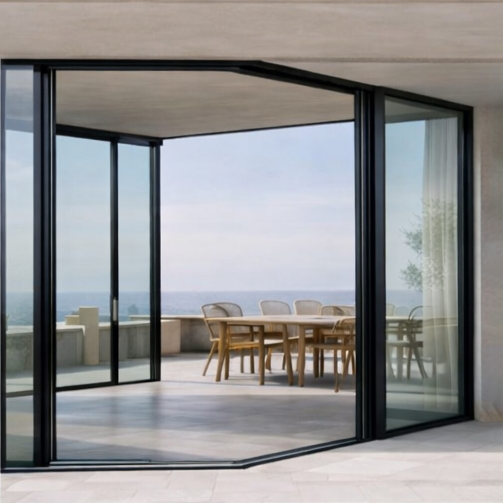 Two sets of doors meeting at 90 degrees without a corner post. When open, the corner of the room dissolves entirely. When closed, you get uninterrupted views on two sides with a slim vertical join where they meet.